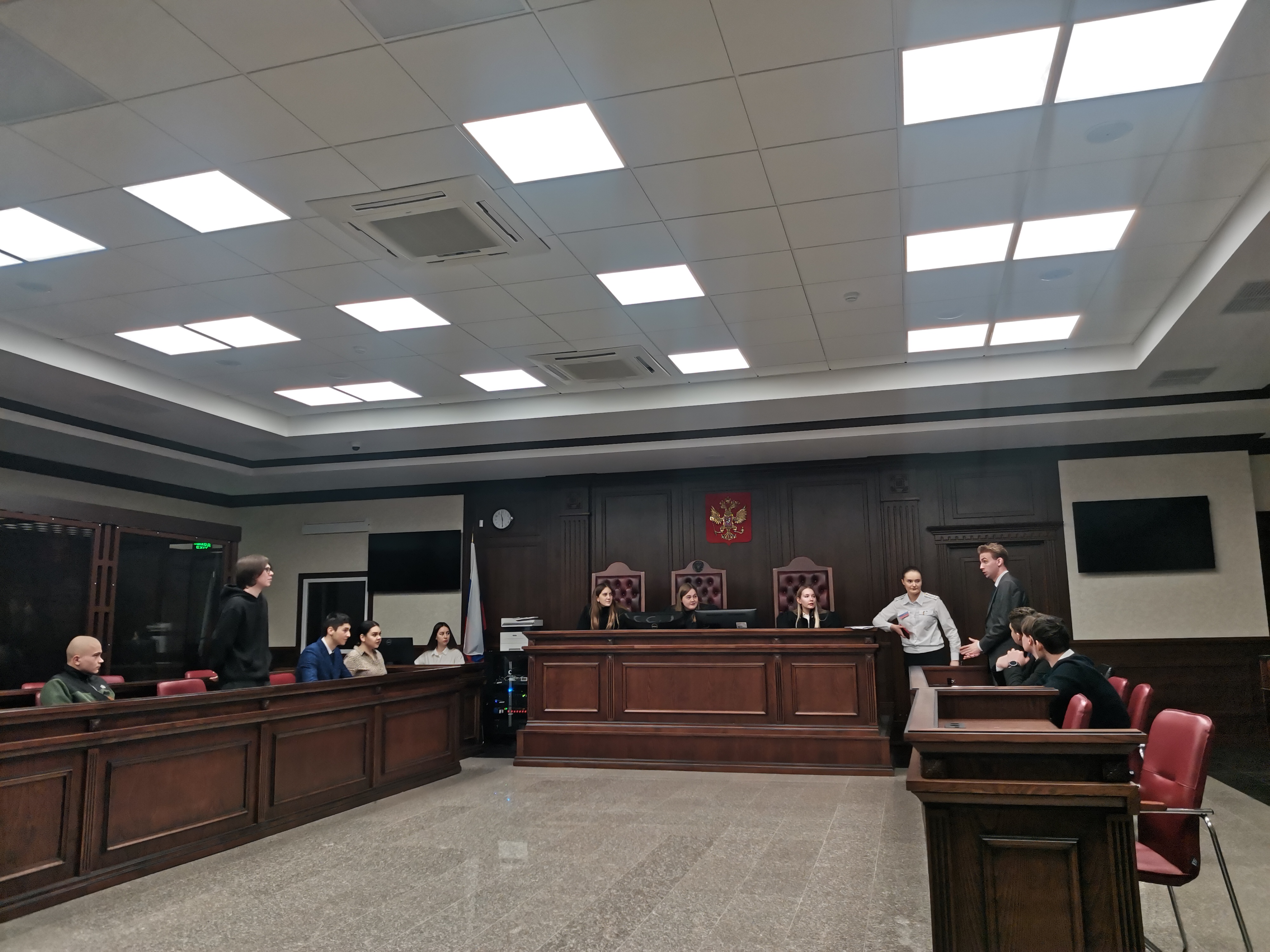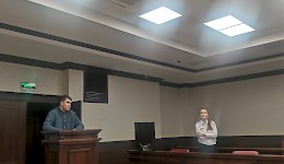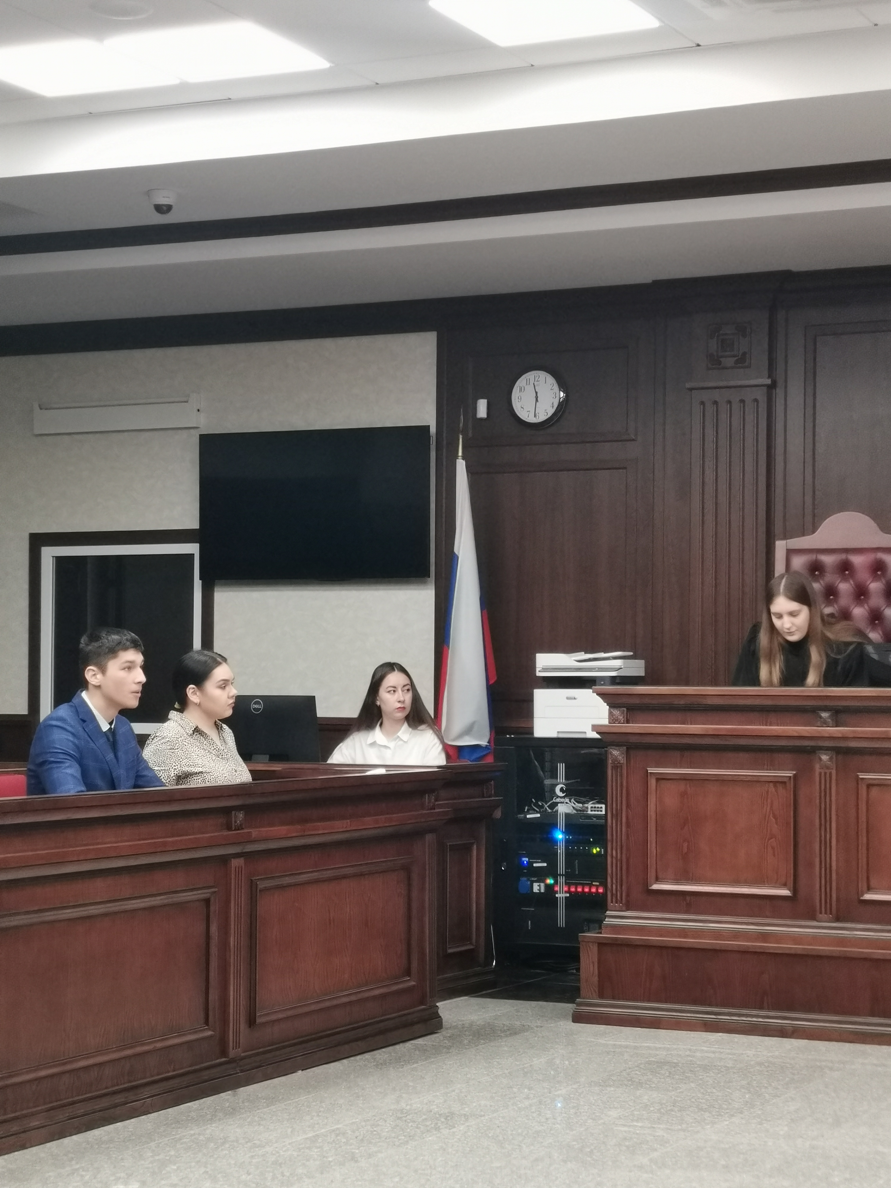 После беседы с судьей наши студенты приняли участие в игровом судебном процессе, примерив на себя роли судей, государственных обвинителей, защитников, секретаря судебного заседания, свидетелей при рассмотрении учебного уголовного дела по обвинению двух подсудимых в действиях, направленных на возбуждение ненависти или вражды с использованием сети «Интернет» (ч.1 ст. 282 УК РФ). Заслушав участников уголовного процесса со стороны обвинения (Акуменко И., Казлихин Д., Шабанов Д.), защиты (Перевезенцев К., Заикина Д.), активных свидетелей (Бабич Г., Кривдиной К., Фетискина И.), при секретаре судебного заседания (Мольчиц П.) судьи в составе (Запеклой О., Брошко П., Гуреевой И.) обсудив в совещательной комнате материалы дела, приняли решение вынести подсудимым оправдательный приговор.