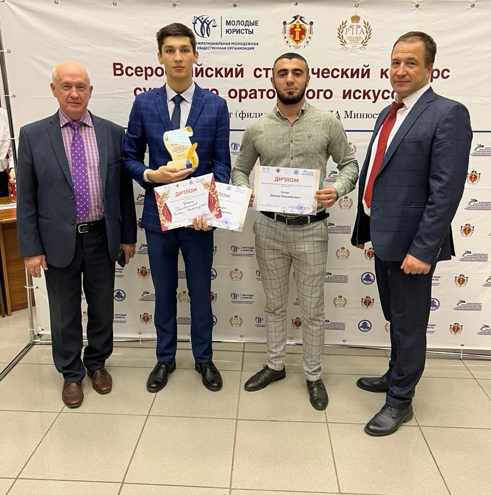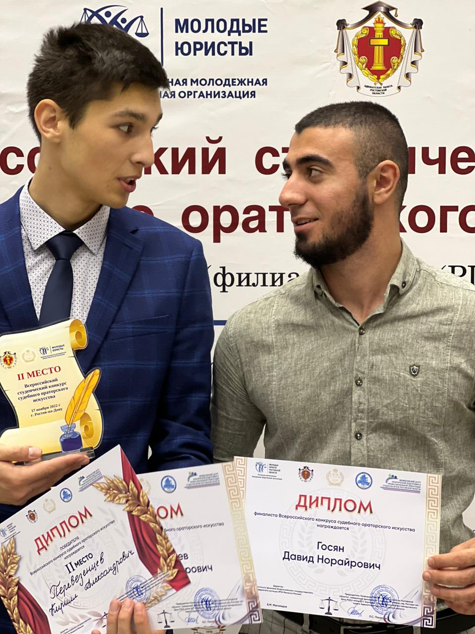 17 ноября 2022 года студенты факультета ЭУП направления подготовки «Юриспруденция» Мищенко Анастасия (ПГБ-4-022), Госян Давид (ПУБ-3-023), Перевезенцев Кирилл (ПУБ-2-028) под руководством доцентов кафедры «Административное право и уголовно-правовые дисциплины» Миллеровой Е.А. и Затона Р.Е. приняли участие в Финале Всероссийского студенческого конкурса судебного ораторского искусства, организованном Ростовской региональной молодежной общественной организацией «Молодые юристы Ростовской области», Межвузовским центром практической подготовки и профессиональной ориентации студентов вузов Ростовской области, проводимом на базе Главного управления министерства юстиции России по Ростовской области.