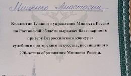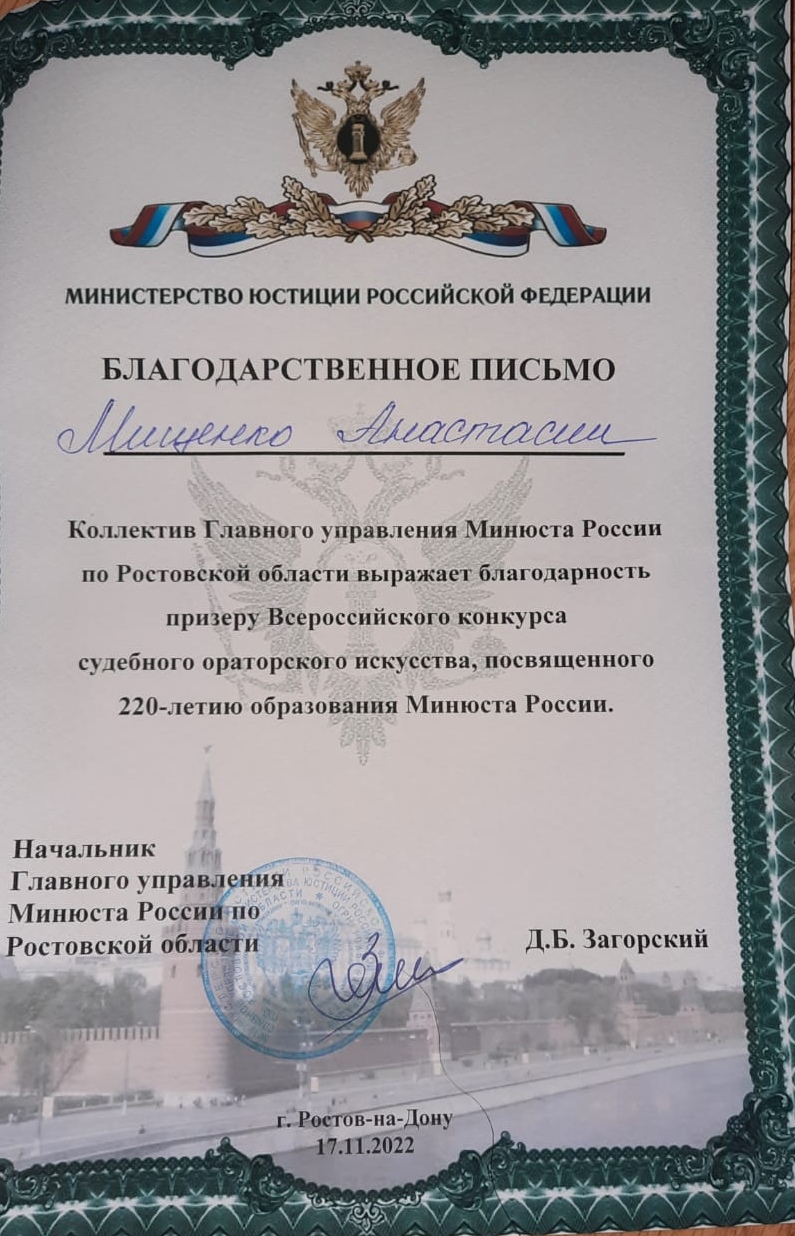 Благодарственным письмом Главного управления минюста России по Ростовской области и дипломом финалиста конкурса награждена Мищенко Анастасия.