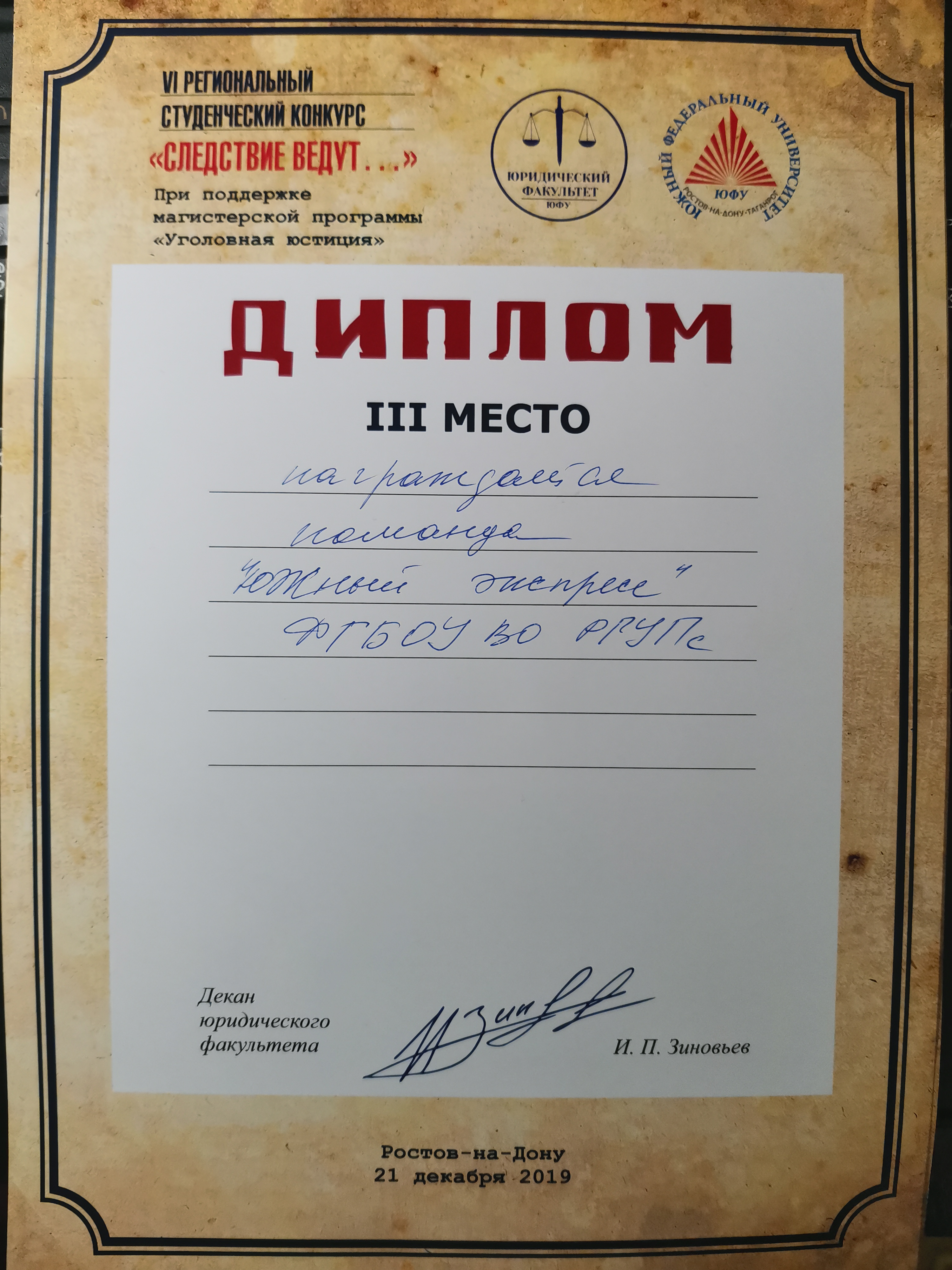 21 декабря 2019 года команда факультета «Экономика, управление и право» «Южный экспресс» под руководством преподавателей кафедры «Административное право и уголовно-правовые дисциплины», приняла участие в ежегодной студенческой юридической деловой игре «СЛЕДСТВИЕ ВЕДУТ…», организованной юридическим факультетом Южного Федерального университета.