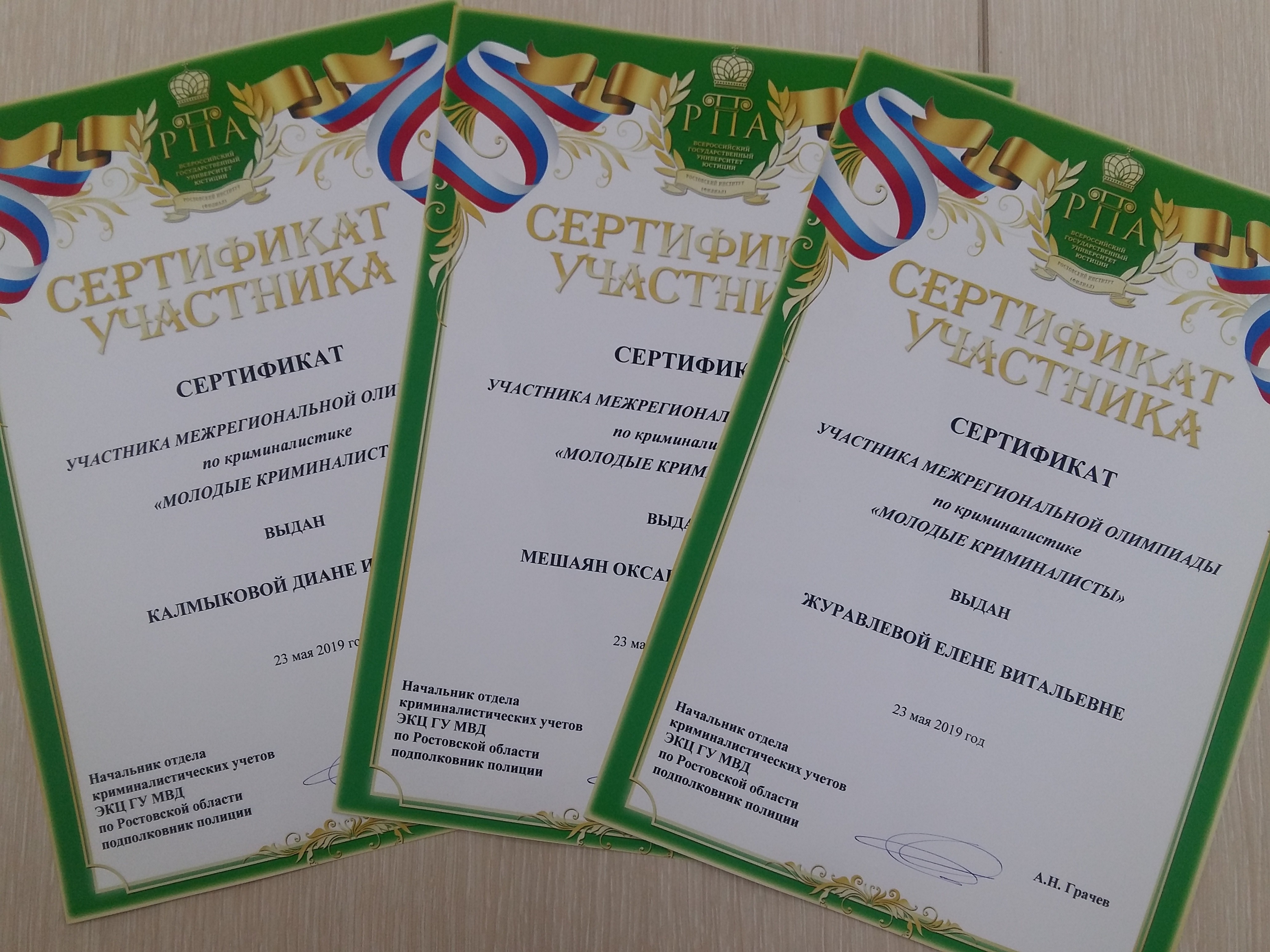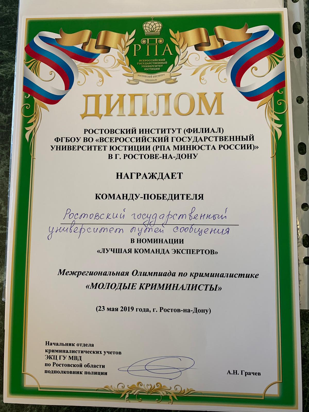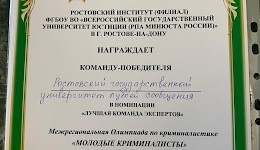 23 мая 2019 г. доценты кафедры «Административное право и уголовно–правовые дисциплины» и «Криминалистика и специальная техника» ФГБОУ ВПО РГУПС, к.ю.н.Р.Е. Затона и к.ю.н. Миллерова Е.А. вместе со студентами группы ПУБ-3-014 Мешаян О.Е., Калмыковой Д.И., Журавлевой Е.В. факультета «Экономика, управление и право» приняли участие в межрегиональной олимпиаде по криминалистике, проводимой Ростовским институтом (филиалом)ВГУЮ РПА (Минюста России).
