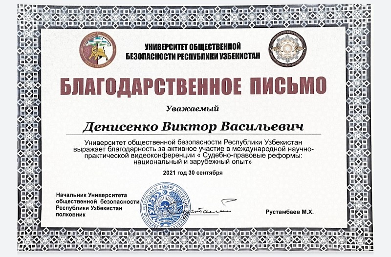 30 сентября 2021 года профессор кафедры «Административное право и уголовно-правовые дисциплины», профессор, д.ю.н. Денисенко Виктор Васильевич принял участие в международной научно-практической видеоконференции «Судебно-правовые реформы: национальный и зарубежный опыт», которая состоялась на базе Университета общественной безопасности Республики Узбекистан.