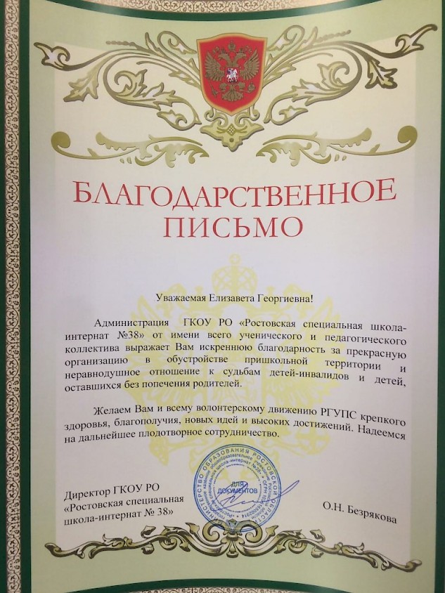 В рамках волонтерского движения и поддержки инициатив Комитета по охране окружающей среды Администрации г. Ростова-на-Дону, студенты группы ПЮБ-2-012 помогли сотрудникам и учащимся школы-интернат для слабовидящих детей № 38 в благоустройстве территории. Студенты вместе с куратором регулярно навещают это учебное заведение: посещают мероприятия, участвуют в Дне древонасаждения и субботниках, дарят нужные и полезные подарки. Администрация школы направила Благодарственные письма в адрес декана факультета ЭУП А.В. Федорова и куратора группы Е.Г. Донченко и рассчитывает на дальнейшее сотрудничество.