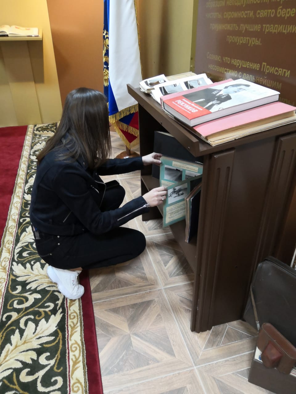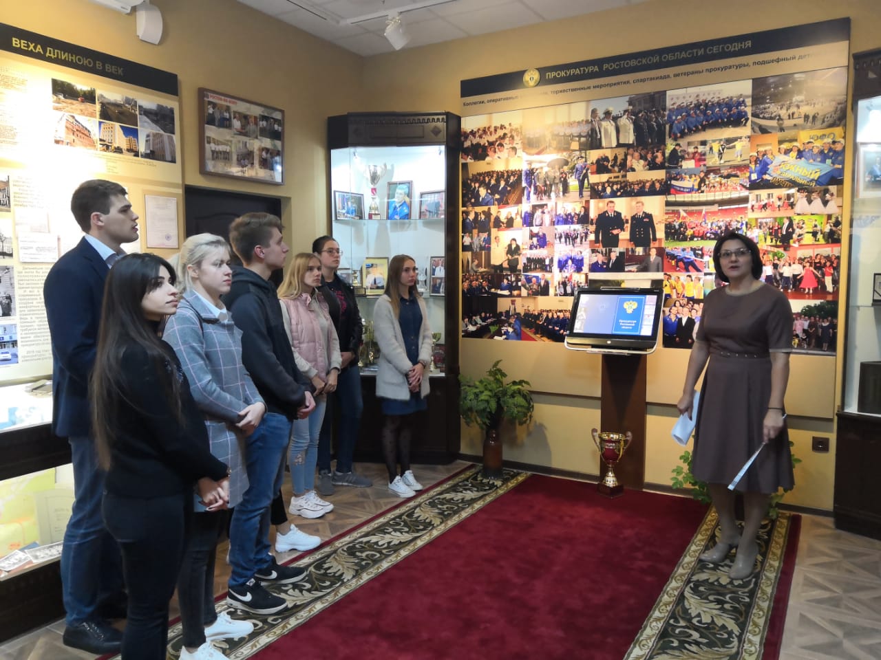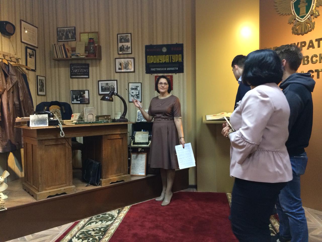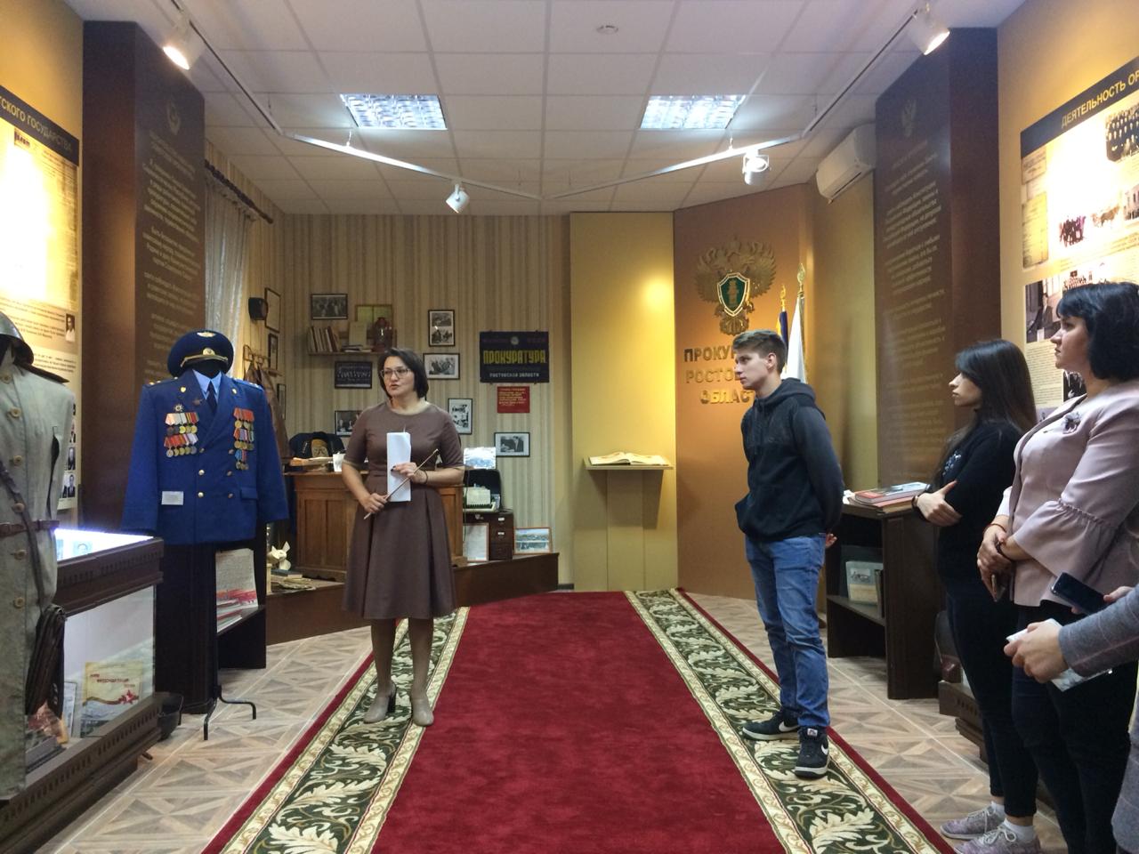 С чувством гордости завершилось пребывание студентов в музее, так как Ириной Алексеевной было отмечено, что немало сотрудников, начинавших свою профессиональную деятельность в прокуратуре Ростовской области занимали и в настоящее время занимают вышестоящие должности в Генеральной прокуратуре РФ (А. Рекунков, Генеральный прокурор СССР с 1981 по 1988 годы), Конституционном Суде РФ (Мельников Н.В. судья Конституционного Суда РФ) и других органах.