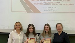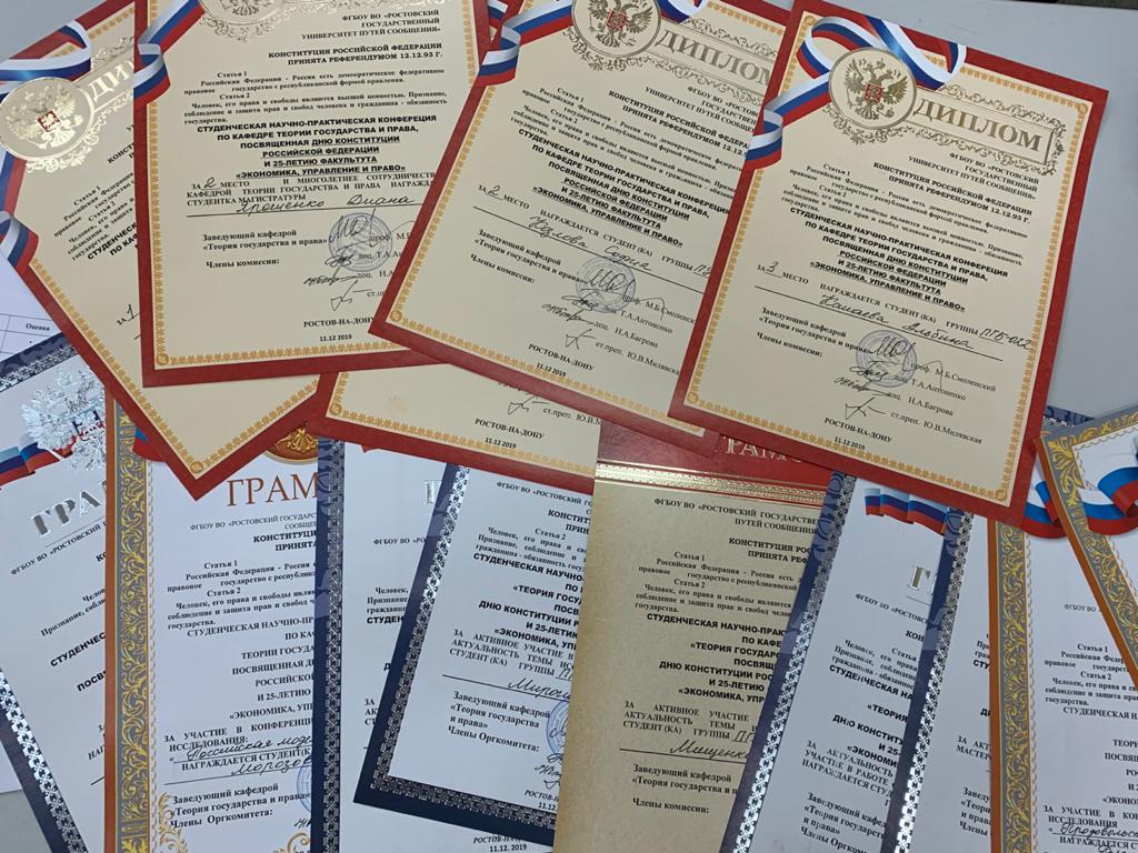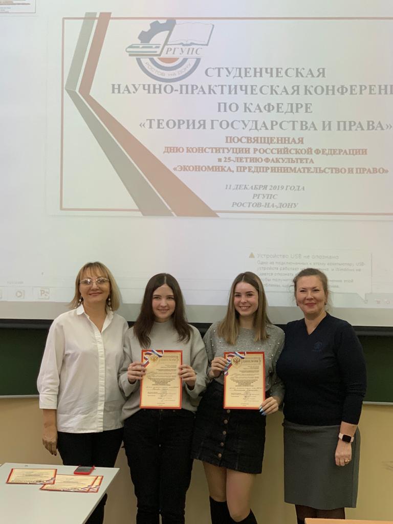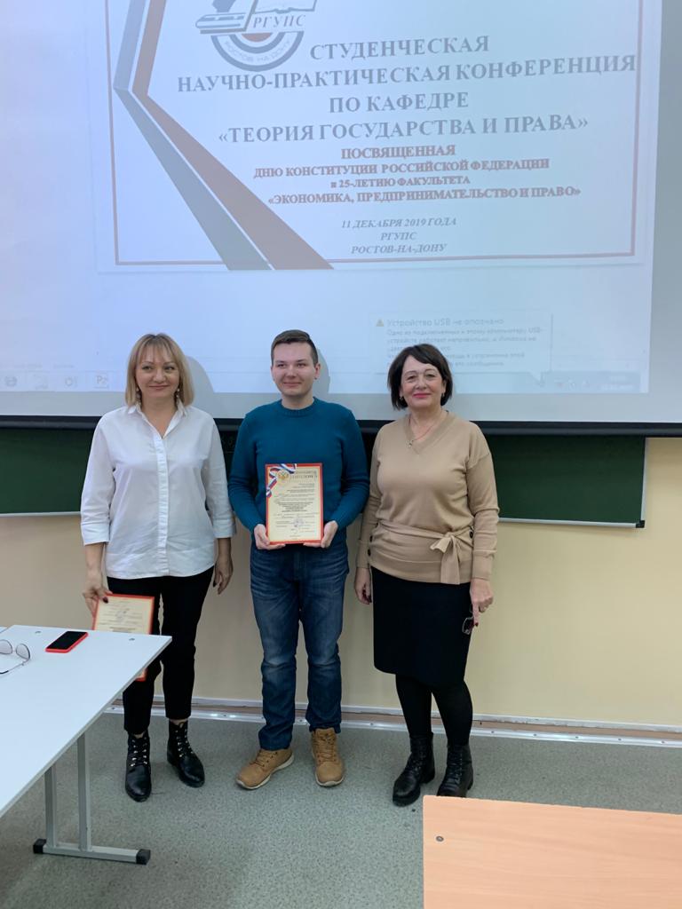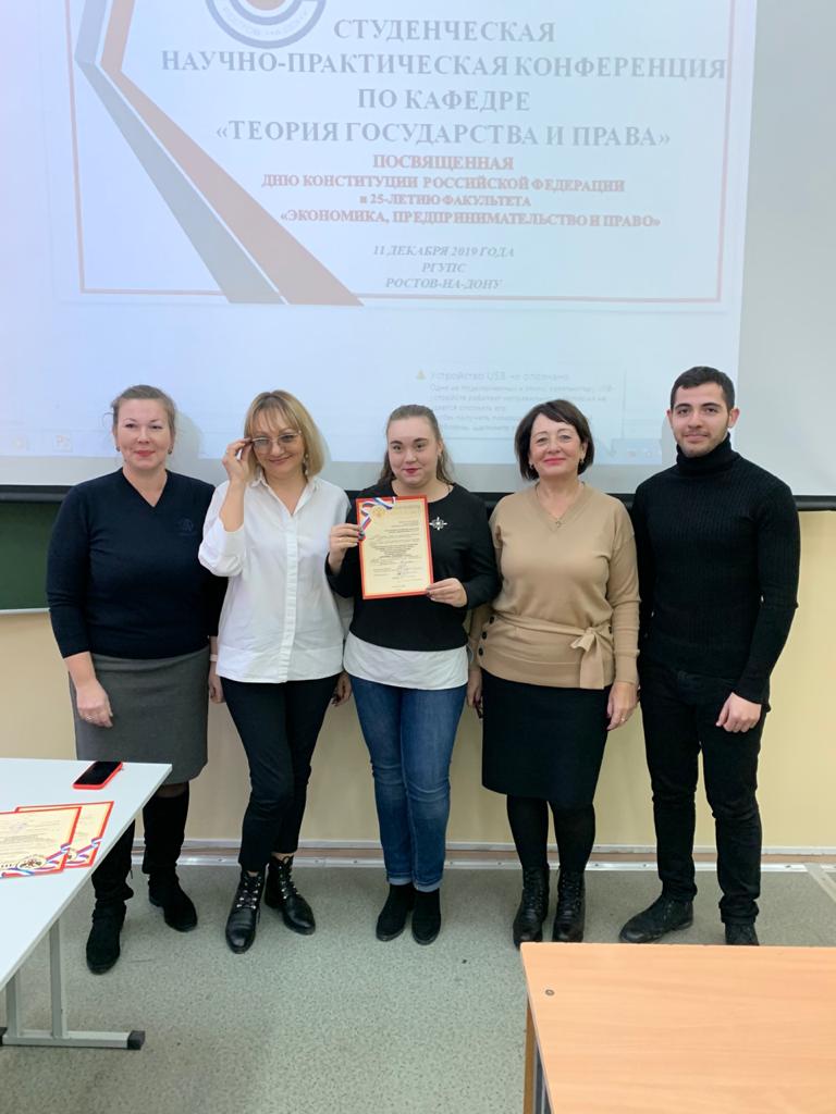 12 декабря 2019 г. преподаватели кафедры Т.А. Антоненко, Н.А. Багрова, Ю.В. Милявская провели студенческую научно-практическую конференцию, посвященную Дню Конституции РФ и 25-летию факультета «Экономика, управление и право». Будущие юристы выступили с докладами, посвященными различным аспектам современного российского конституционализма. Авторы лучших докладов были награждены дипломами.