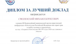 По итогам конференции заведующий кафедрой «Теория государства и права» М.Б. Смоленский был награжден дипломом за лучший доклад на тему «Поправки в Конституцию РФ 1993 года и 2020 года: значение и смыслы».