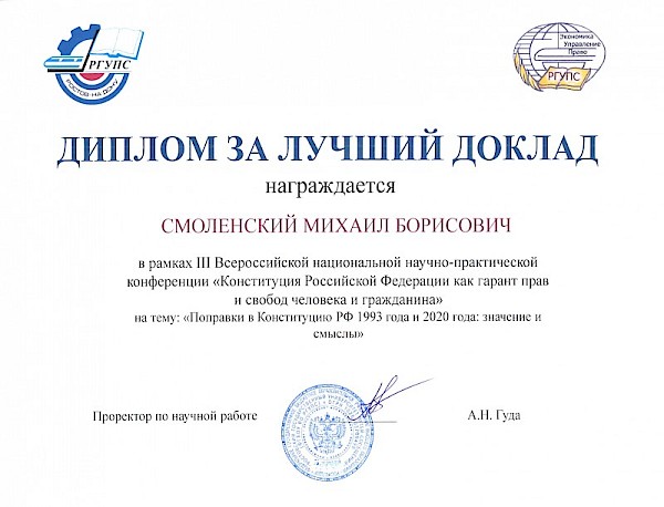 По итогам Третьей Всероссийской национальной научно-практической конференции «Конституция Российской Федерации как гарант прав и свобод человека и гражданина» М.Б. Смоленский был награжден дипломом за лучший доклад на тему: «Поправки в Конституцию РФ 1993 года и 2020 года: значение и смыслы».