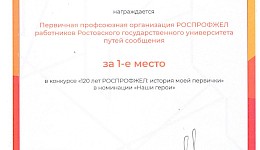 Также на Съезде профсоюзных работников наградили государственными и отраслевыми наградами. Председателю ППО работников РГУПС Ивану Анатольевичу Яицкову был вручен диплом за 1-е место во Всероссийском конкурсе «120 лет РОСПРОФЖЕЛ: история моей первички» в номинации «Наши герои».