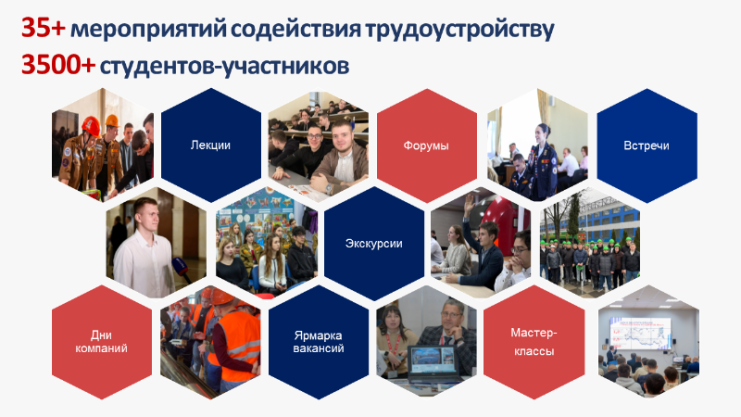 Этому способствует системная работа в течении всего периода обучения. Так в 2024-25 учебном году в рамках реализации программы по взаимодействию университета с ОАО «РЖД», а также с крупными предприятиями и организациями различных форм собственности для повышения уровня трудоустройства состоялись более 35 мероприятий, которые посетили 3500+ студентов.
