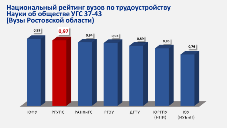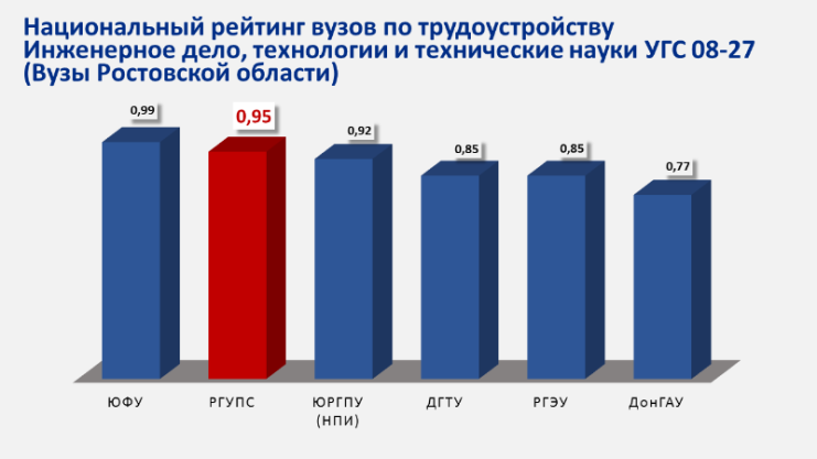 Согласно Национального рейтинга по трудоустройству выпускников Вузов РГУПС с числом выпускников выше медианного значения в группе «Инженерное дело, технологии и технические науки» среди ведущих вузов Ростовской области занимает 2-е место. В группе «Науки об обществе» мы также стабильно занимаем вторую позицию среди вузов Ростовской области.